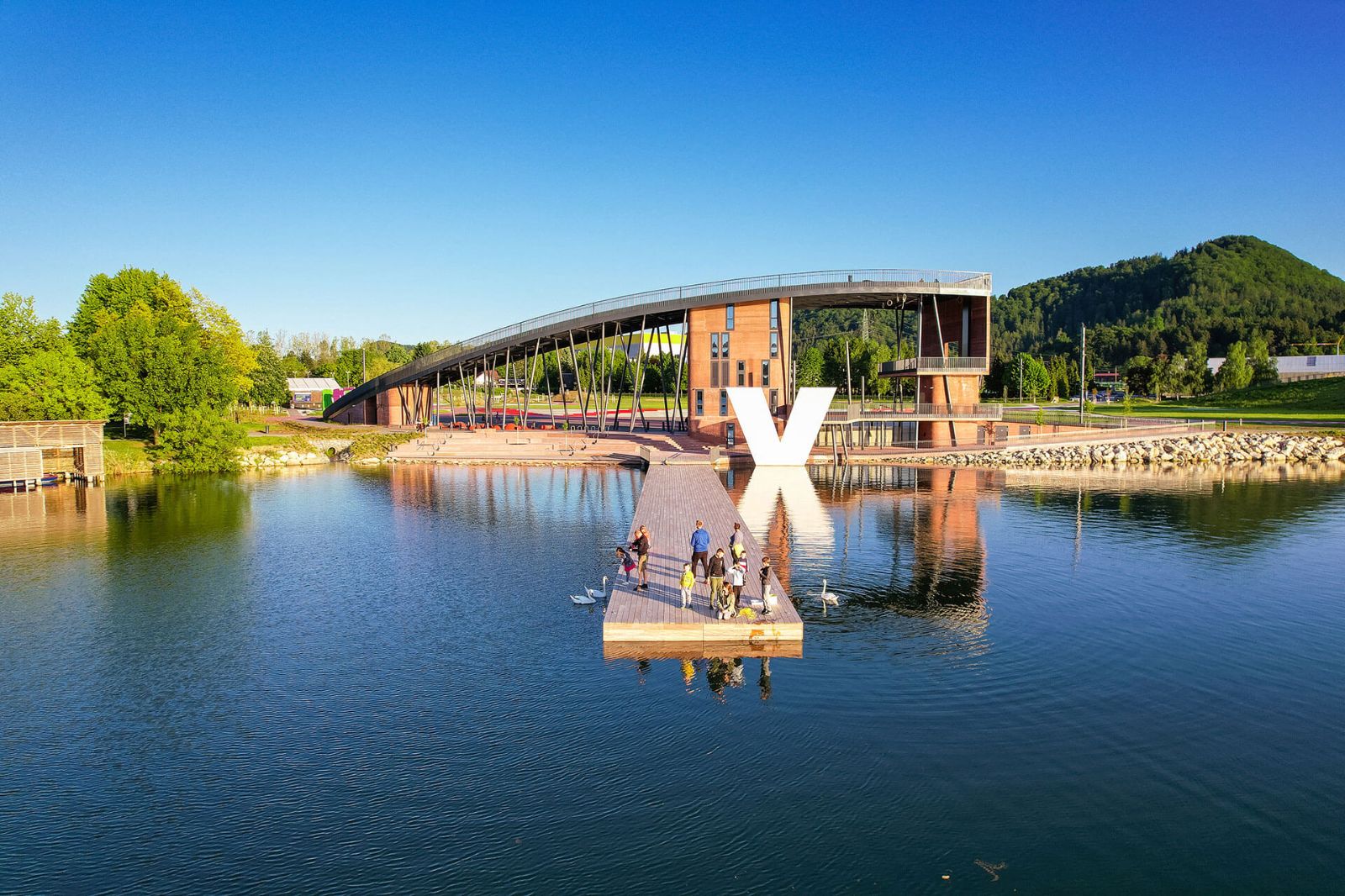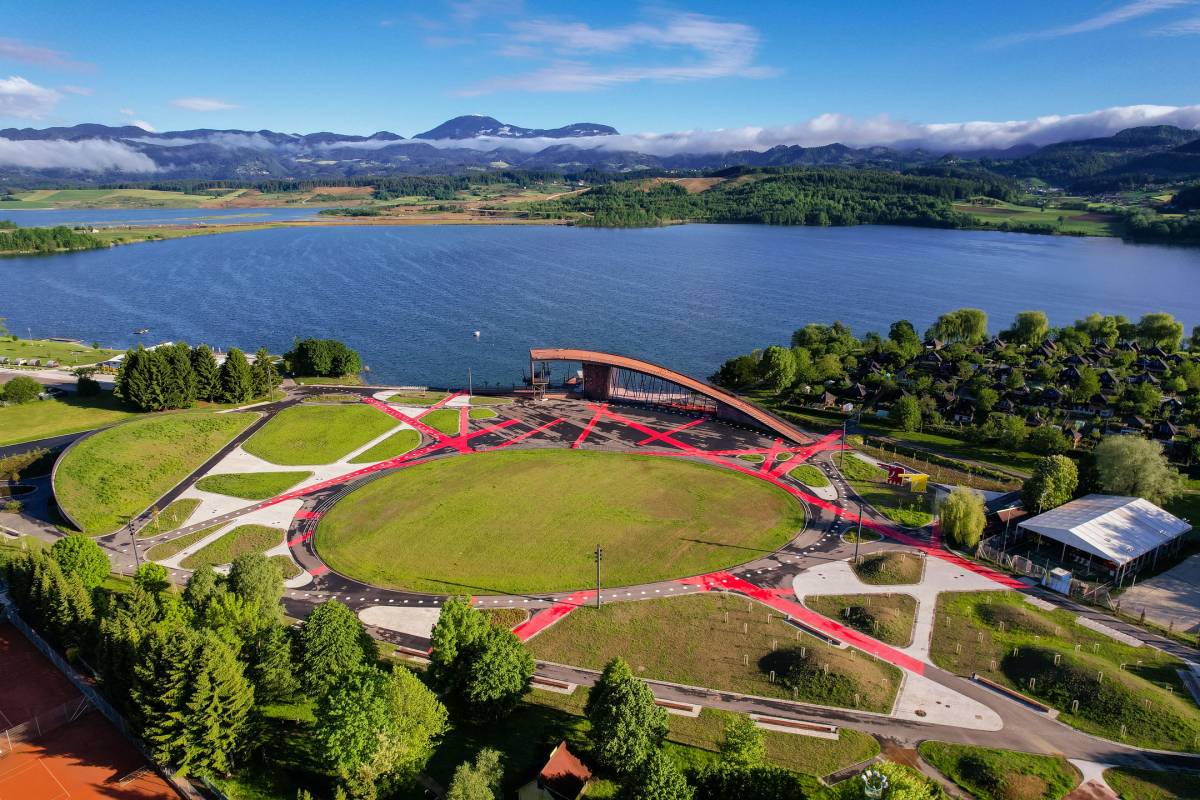 At the roundabout, turn onto Partizanska Street and follow the signs for Vista Park by Lake Velenje.